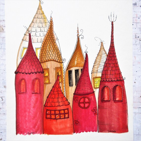 Disegno stravagante di tetti rossi, opere d'arte originali, illustrazioni con pennarelli, decorazioni per la casa colorate, tetti unici, disegni di cartoni animati, graziose opere d'arte da parete - Etsy Italia