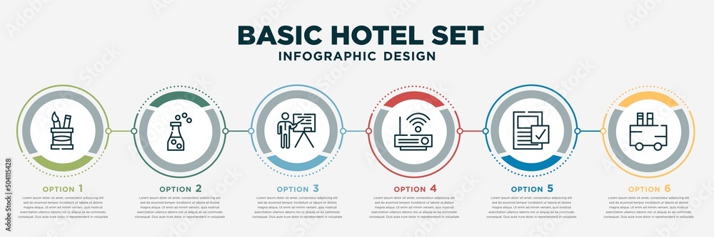Infographic template design with basic hotel set icons. basic hotel set concept with 6 options or steps. included artist tools, flask with bubbles, teacher pointing at blackboard, wifi modem, Stock Vector |