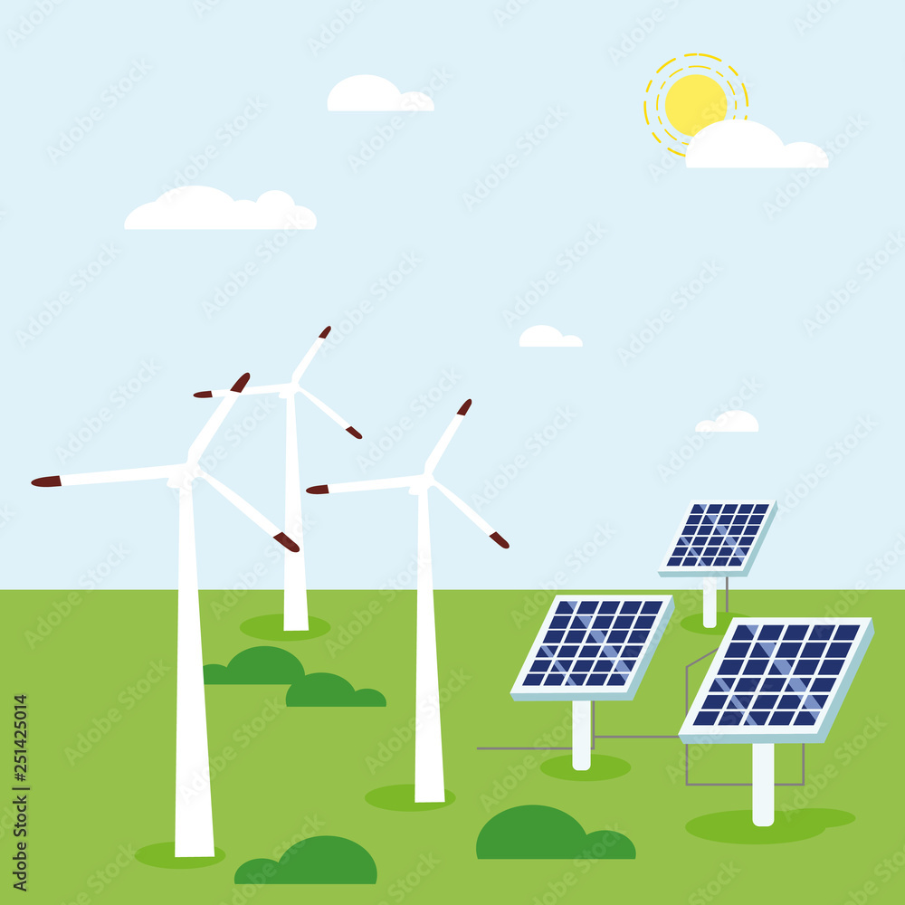 Wind and Solar Energy vector design. Illustration showing solar panels and a wind turbine Stock Vector Image & Art - Alamy