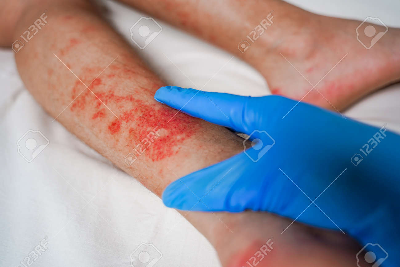 Immagini Stock - Eczema Malattia Della Pelle Sulle Gambe, Eruzioni Cutanee Rosse Pruriginose E Macchie. Image 170133486