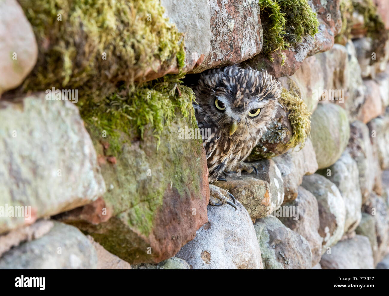 Piccolo gufo (nome scientifico: Athene noctua) con la faccia triste, arroccato in habitat naturale di stalattite parete e sbirciando fuori della parete a sinistra Foto stock - Alamy