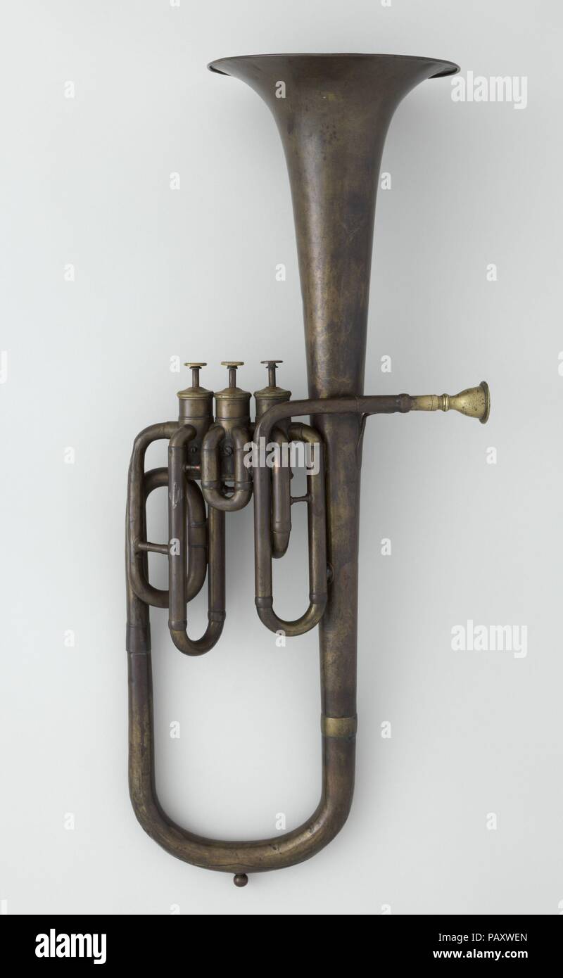 Alto Saxhorn in E-flat. Cultura: eventualmente francese. Dimensioni: L. 64,4 cm (25-3/8 in.); Diam. di bell: 19.1 cm (7-1/2 in.). Data: ca. 1850-60. Alto saxhorn in E-Flat con tre valvole di Berlino.