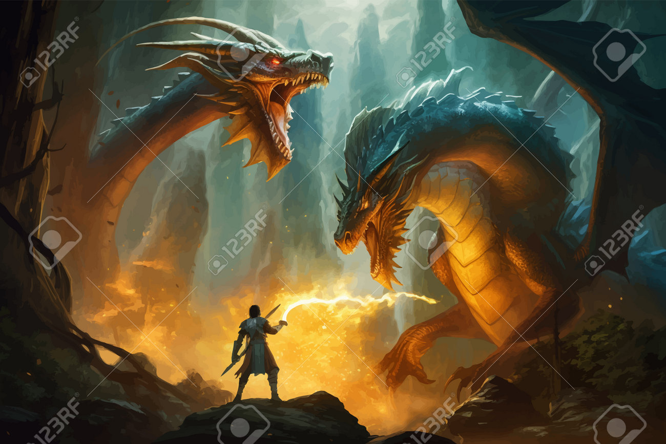 Immagini Stock - Mago E Un Enorme Drago In Scena Fantasy Nella Battaglia Nella Grotta Di Un Mago Con Una Creatura Mitica Che Combattono Contro Il Combattimento Di Mostri Illustrazione Vettoriale 3d