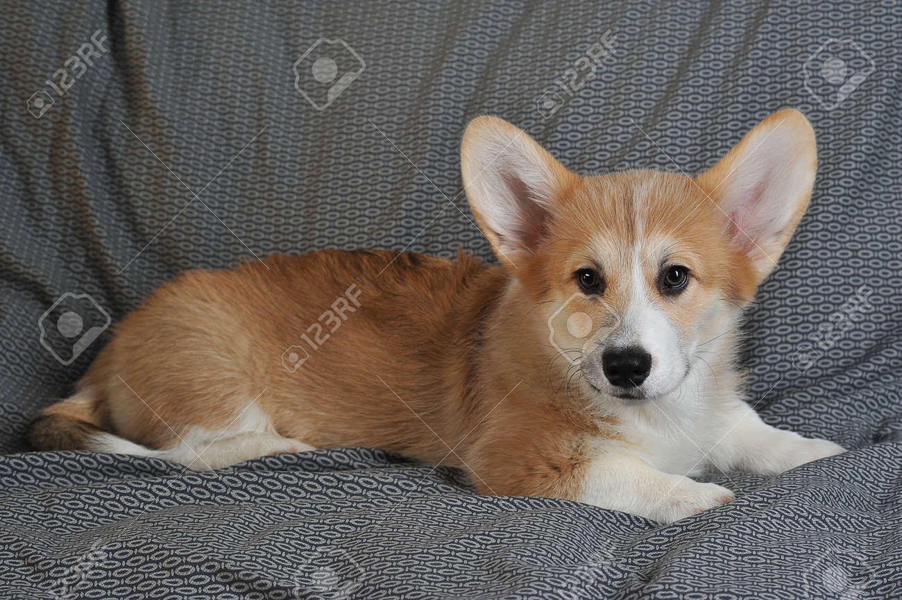 Immagini Stock - Il Cucciolo Di Cane Welsh Corgi Pembroke È Sdraiato Su Una Coperta Grigia - Simpatico Corgi. Image 146088480
