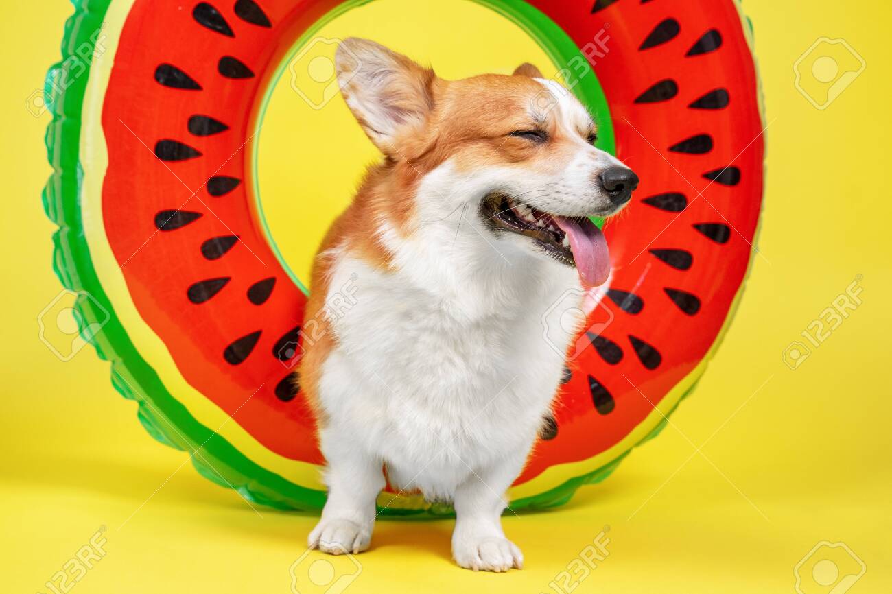 Immagini Stock - Adorabile Cane Pembroke Welsh Corgi Con Una Faccia Felice, Gli Occhi Chiusi E Un Sorriso, Rilassante Sul Materasso Ad Aria Anello Di Nuoto Anguria Su Sfondo Giallo. Turismo, Ricreazione..