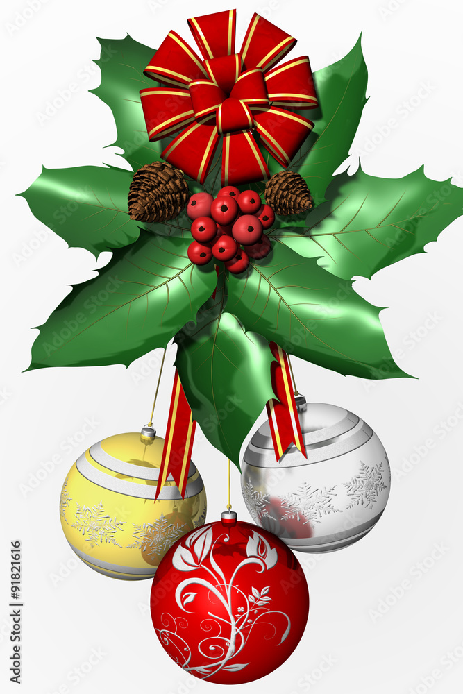 Agrifoglio Natale 003 Foglie e bacche di agrifoglio con fiocco rosso e dorato e palle di Natale a formare decorazione Natalizia. Stock Illustration | Adobe Stock