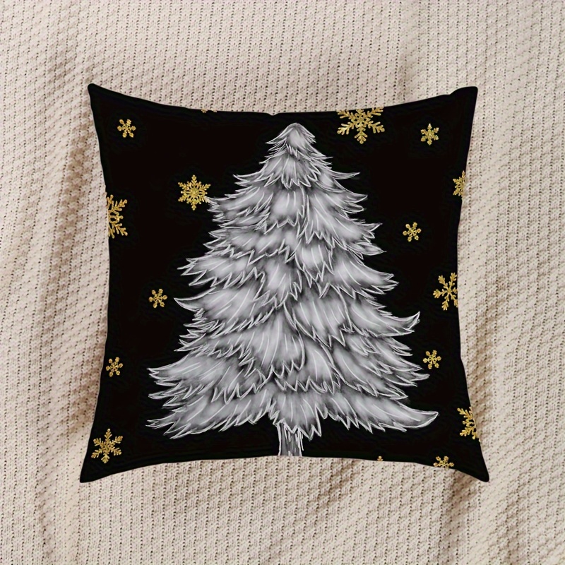 1Pc, Copertura Cuscino Natale Nero, Albero Di Natale Grigio E Fiocco Di Neve Dorato Stampato Federa