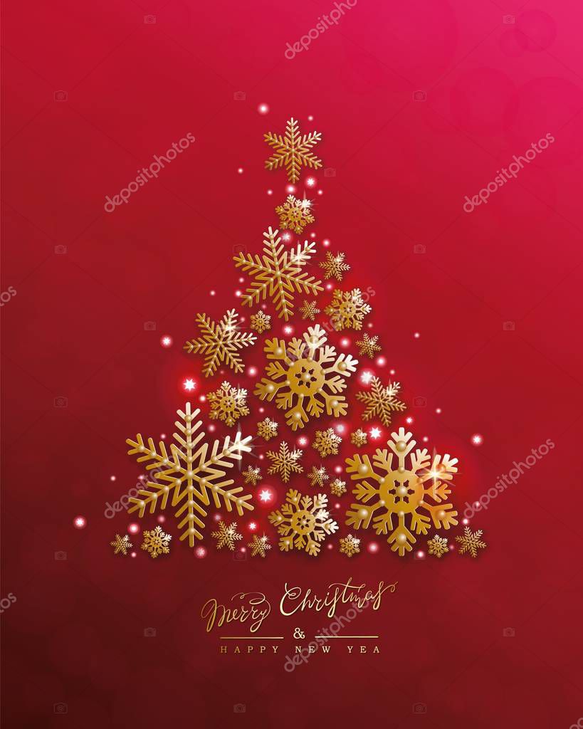 Albero di Natale, fiocco di neve dorato, luci, sfondo rosso. Nuovo anno vettoriale design - Vettoriale Stock di ©SMSka 294762986