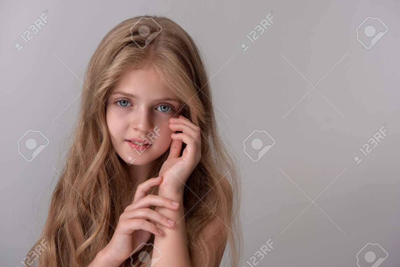 La Bambina Carina Di 67 Anni Con I Capelli Molto Lunghi Esprime Gioia Emotiva E Un Sorriso Su Uno Sfondo Bianco - Fotografie stock e altre immagini di Abbigliamento casual - iStock