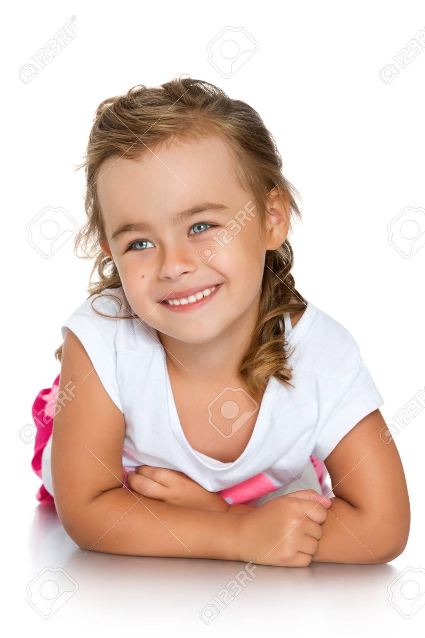 Una Bambina Carina Di 6-7 Anni Con I Capelli Biondi Esprime Gioia Emotiva E Un Sorriso Su Uno Sfondo Bianco Un Bambino Abbronzato Immagine Stock - Immagine di sfondo, allegro: 197328789