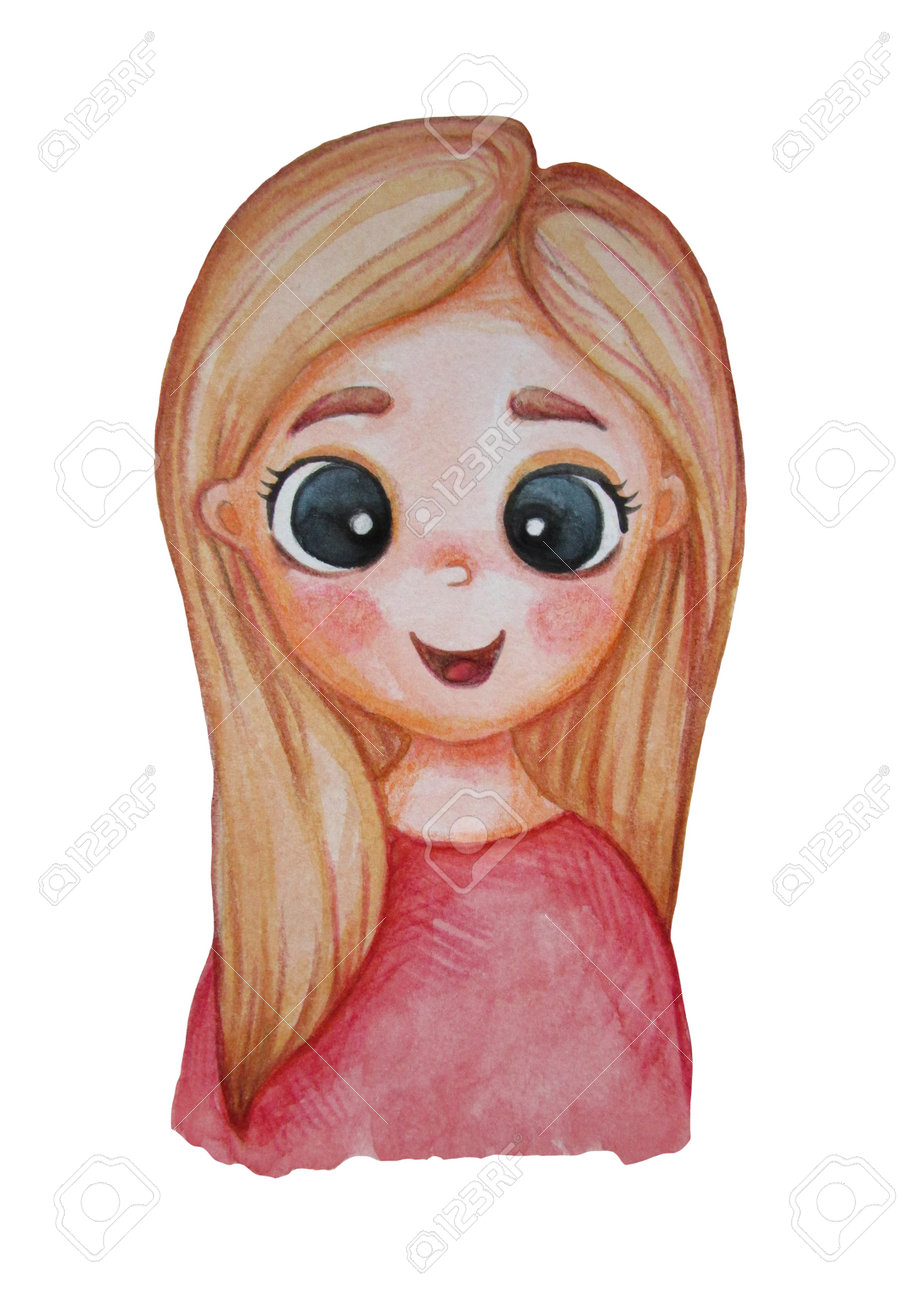 SVG, Vettoriale - Ritratto Di Una Piccola Bionda Carina Con I Capelli Lunghi Con Un Sorriso E In Abiti Rosa Su Sfondo Bianco. Acquerello. Personaggio Per Collezione Per Bambini, Cartoline, Design E