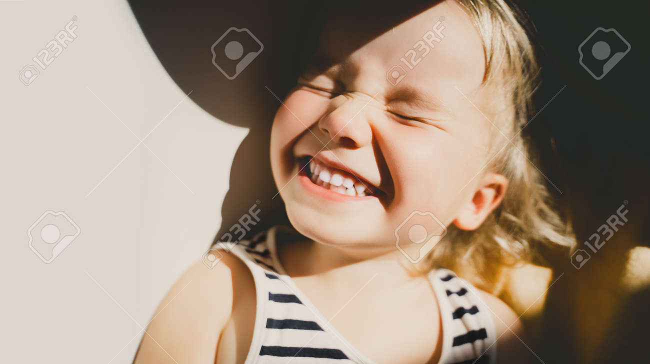 Immagini Stock - La Bambina Più Carina Che Sorride E Strizza Gli Occhi Alla Luce Del Sole. Bambino Felice Che Si Diverte. Ritratto Di Bambino Giocoso In Età Prescolare. Fotografia Di Stile