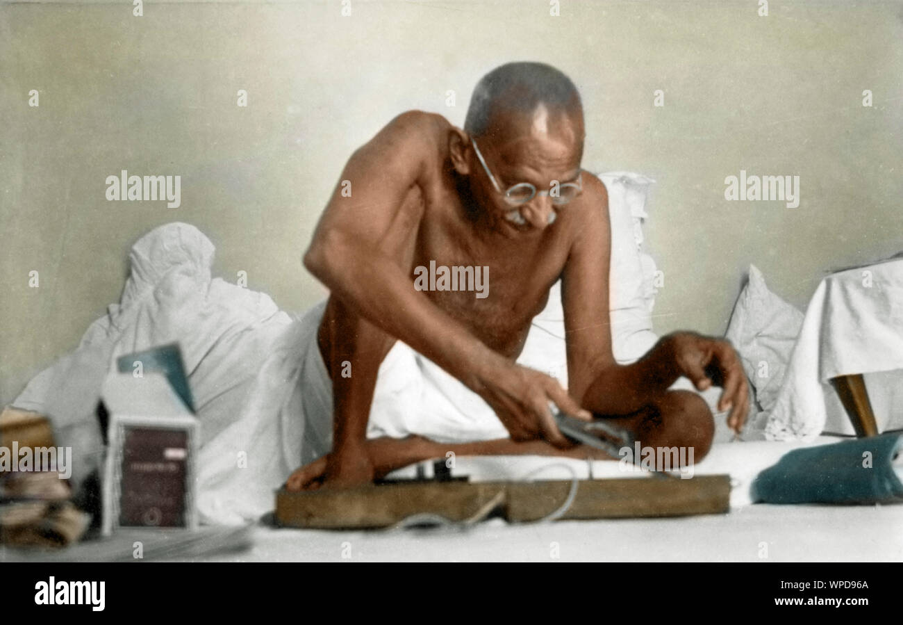 Mahatma Gandhi working on charkha spinning wheel, India, Asia, 1946, old vintage 1900s picture Stock Photo - Alamy