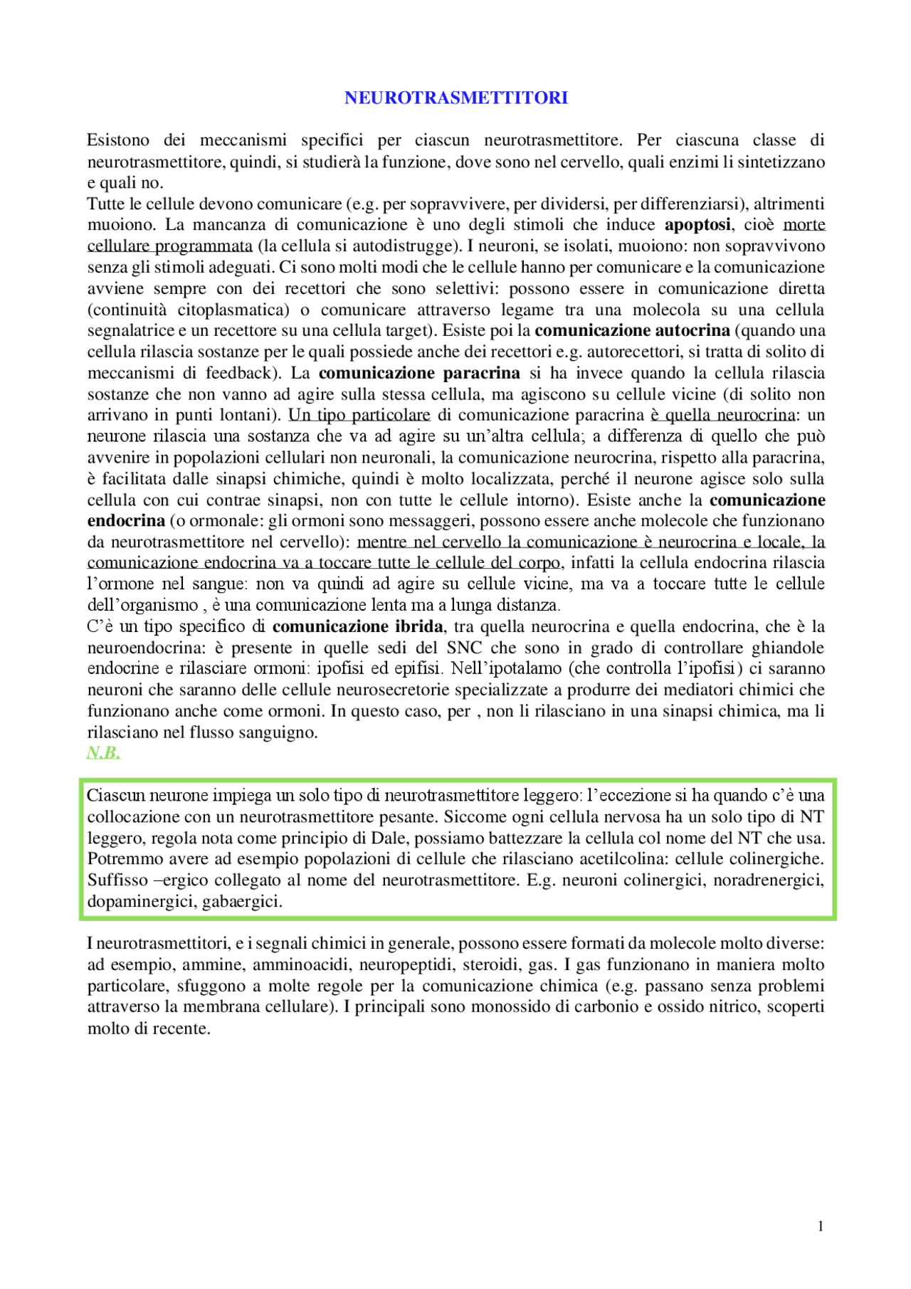 Psicobiologia - Neurotrasmettitori | Sintesi del corso di Psicobiologia | Docsity