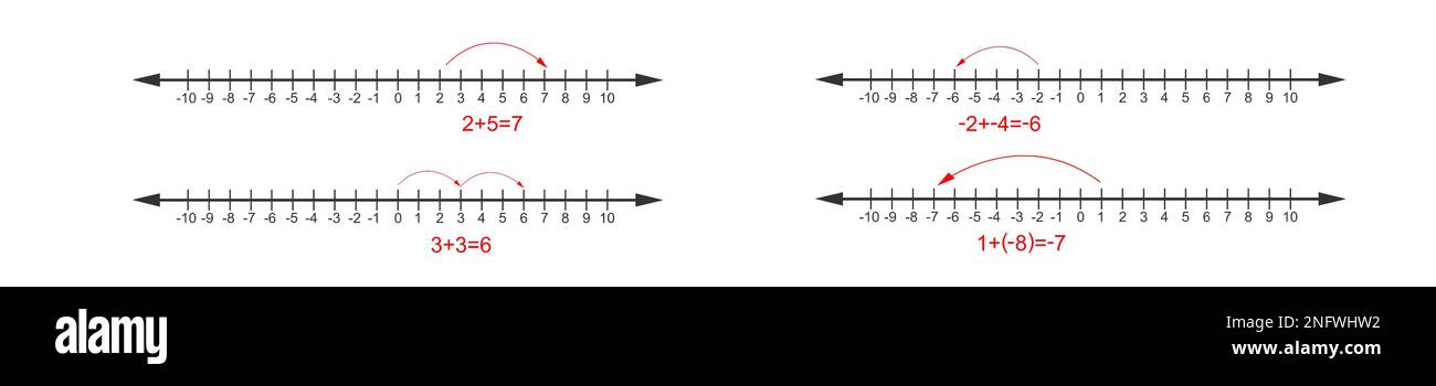 Esempi di operazioni di addizione e sottrazione che utilizzano numeri interi sulla riga numerica. Grafico matematico con numeri negativi, positivi e zero isolati su bianco Immagine e Vettoriale - Alamy