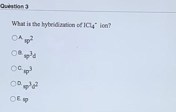 Solved Question 3 What is the hybridization of ICl4- ion? A. | Chegg.com
