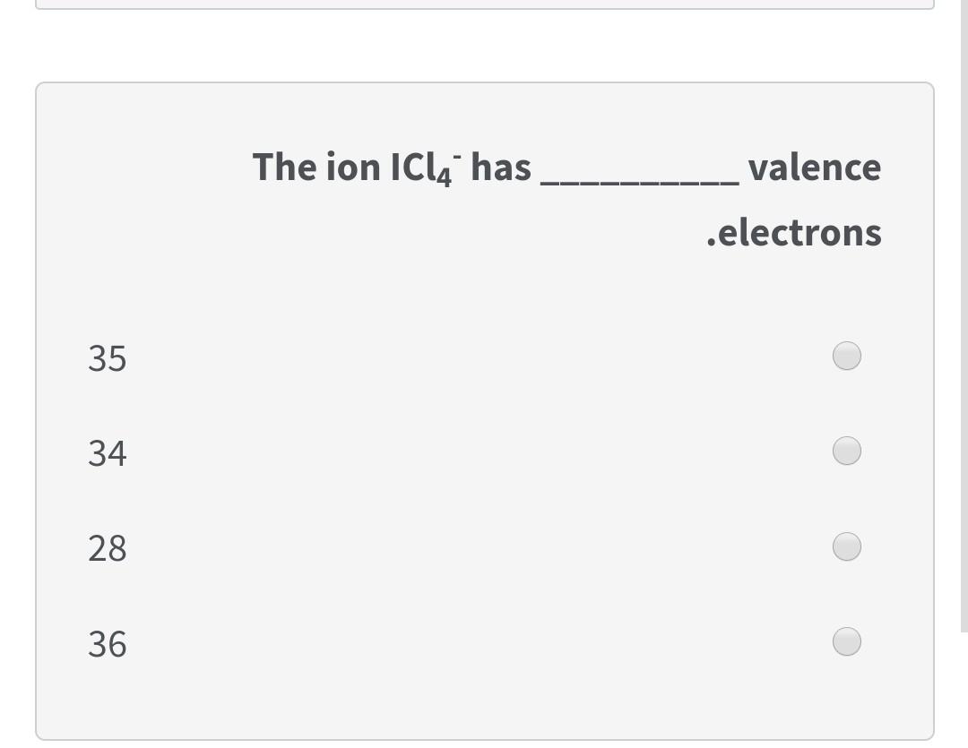 Solved The ion ICl4 has valence .electrons 3 35 34 28 36 | Chegg.com
