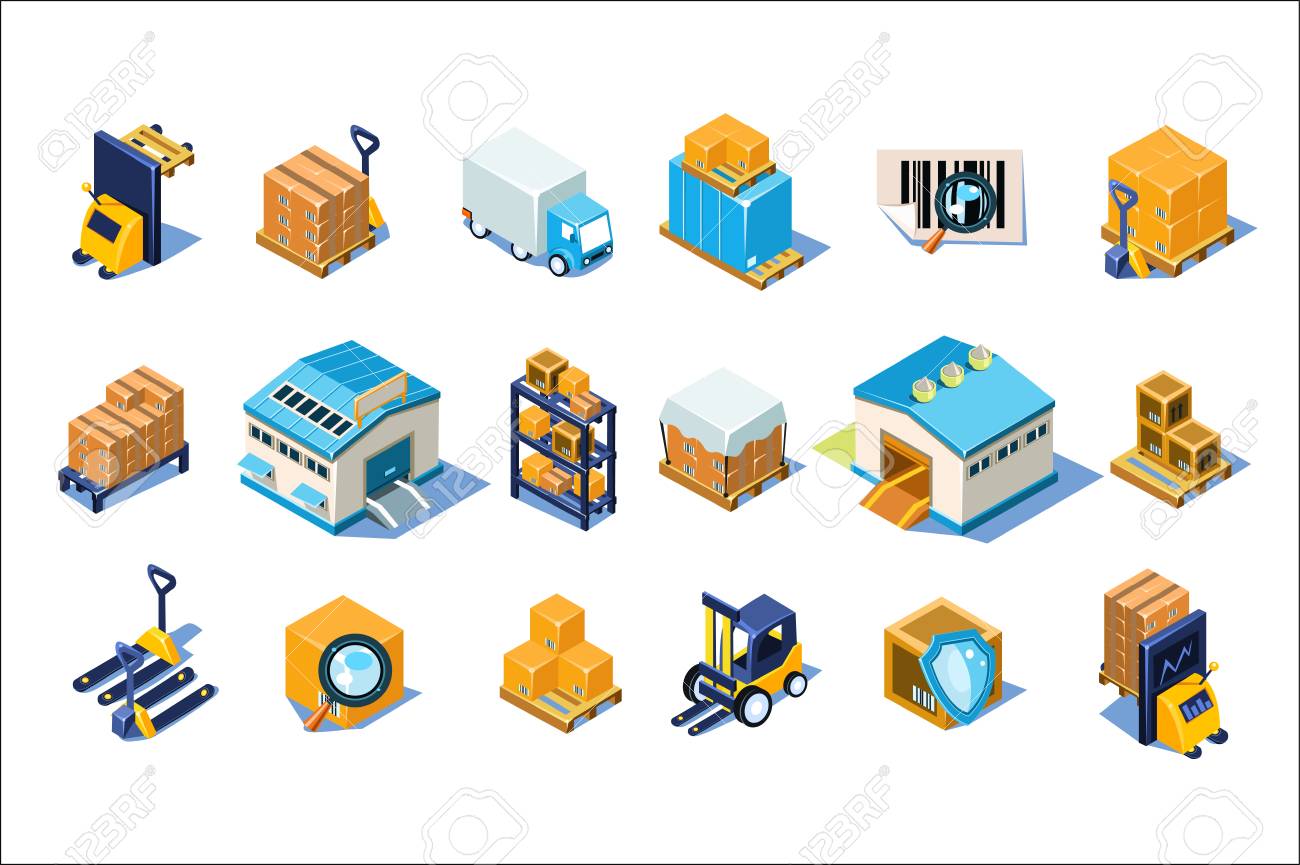 Warehouse Icons Set, Storage Equipment, Warehouse Building, Forklift, Storage Racks, Pallets With Goods Vector Illustrations Isolated On A White Background. Royalty Free SVG, Cliparts, Vectors, and Stock Illustration. Image 99991355.