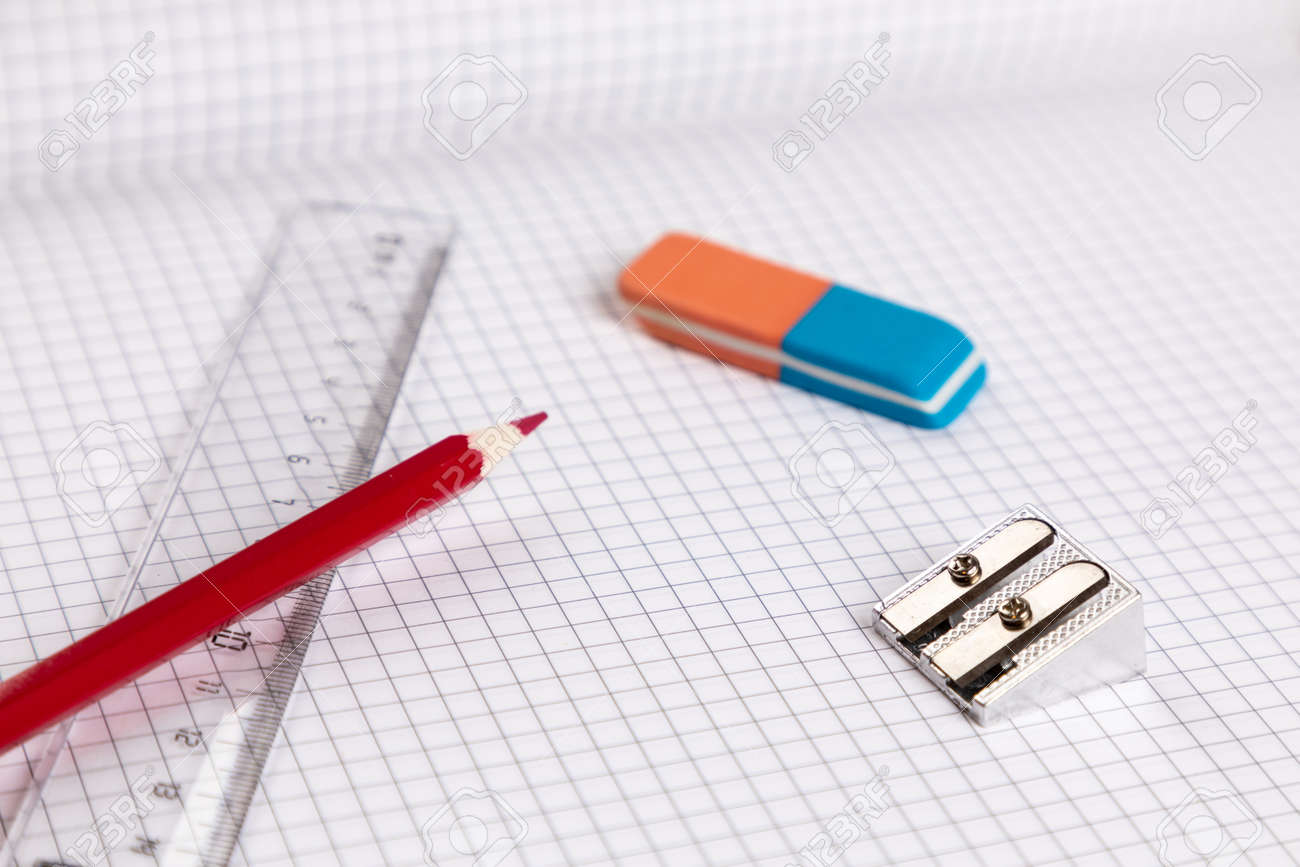 Immagini Stock - Righello Per Attrezzature Scolastiche, Gomma Da Cancellare Con Carta A Quadretti. Image 123083904