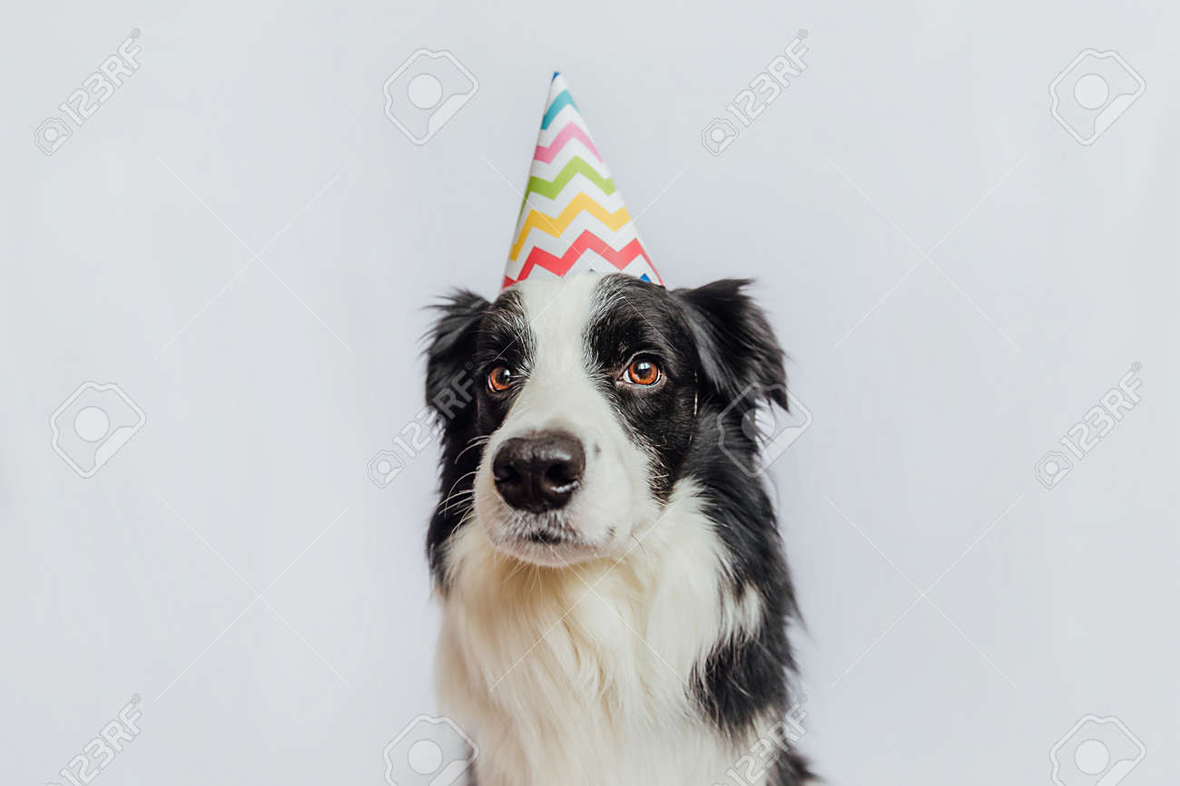 Immagini Stock - Concetto Di Festa Di Buon Compleanno. Divertente Simpatico Cucciolo Di Cane Border Collie Indossando Il Cappello Sciocco Di Compleanno Isolato Su Sfondo Bianco. Cane Da Compagnia Il Giorno Del