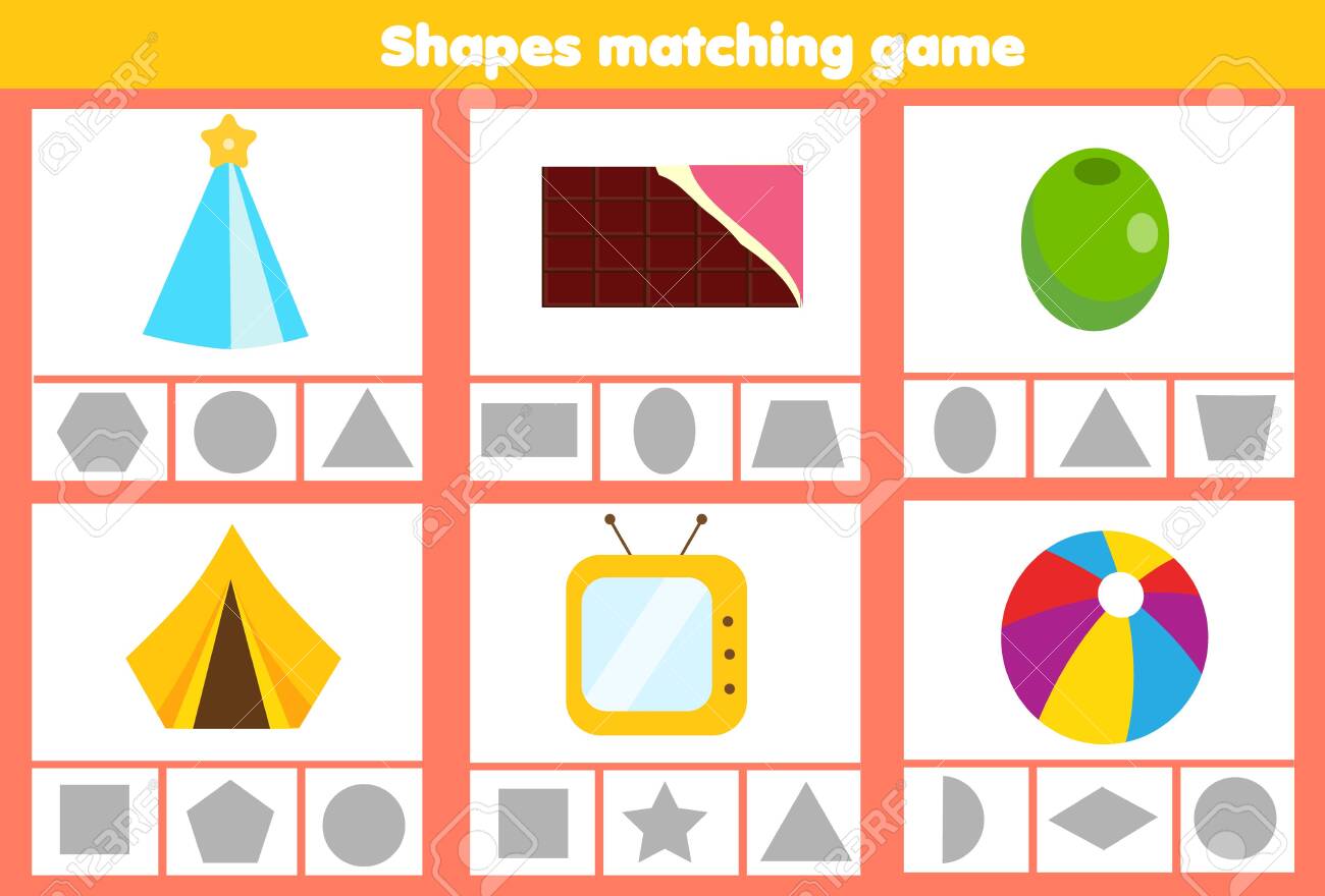 SVG, Vettoriale - Gioco Educativo Per Bambini Abbinato. Abbina Oggetti Reali A Forme Geometriche. Attività Di Moduli Di Apprendimento Per Bambini E Ragazzi. Triangolo, Quadrato, Cerchio, Pentagono. Image 142167397