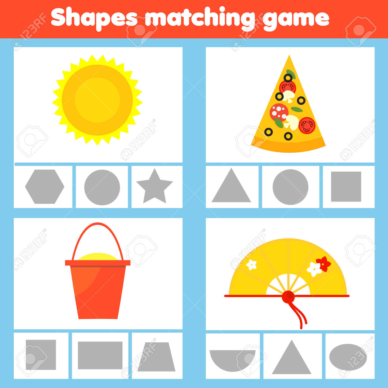 SVG, Vettoriale - Gioco Educativo Per Bambini Abbinato. Abbina Oggetti Reali A Forme Geometriche. Attività Di Moduli Di Apprendimento Per Bambini E Ragazzi. Triangolo, Trapezio, Cerchio, Semicerchio. Image 173076012
