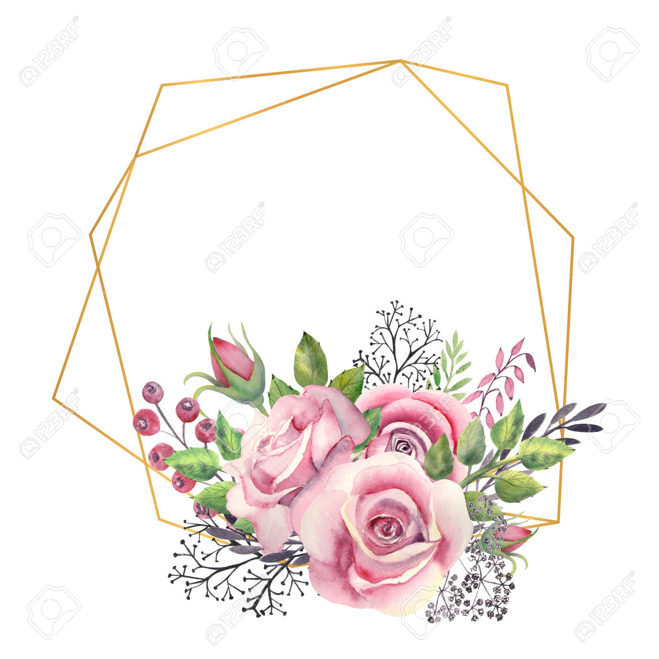Immagini Stock - Fiori Di Rosa Rosa, Foglie Verdi, Bacche In Una Cornice Geometrica Dorata. Concetto Di Matrimonio Con Fiori. Composizioni Acquerellate Per La Decorazione Di Biglietti Di Auguri O Inviti.. Image