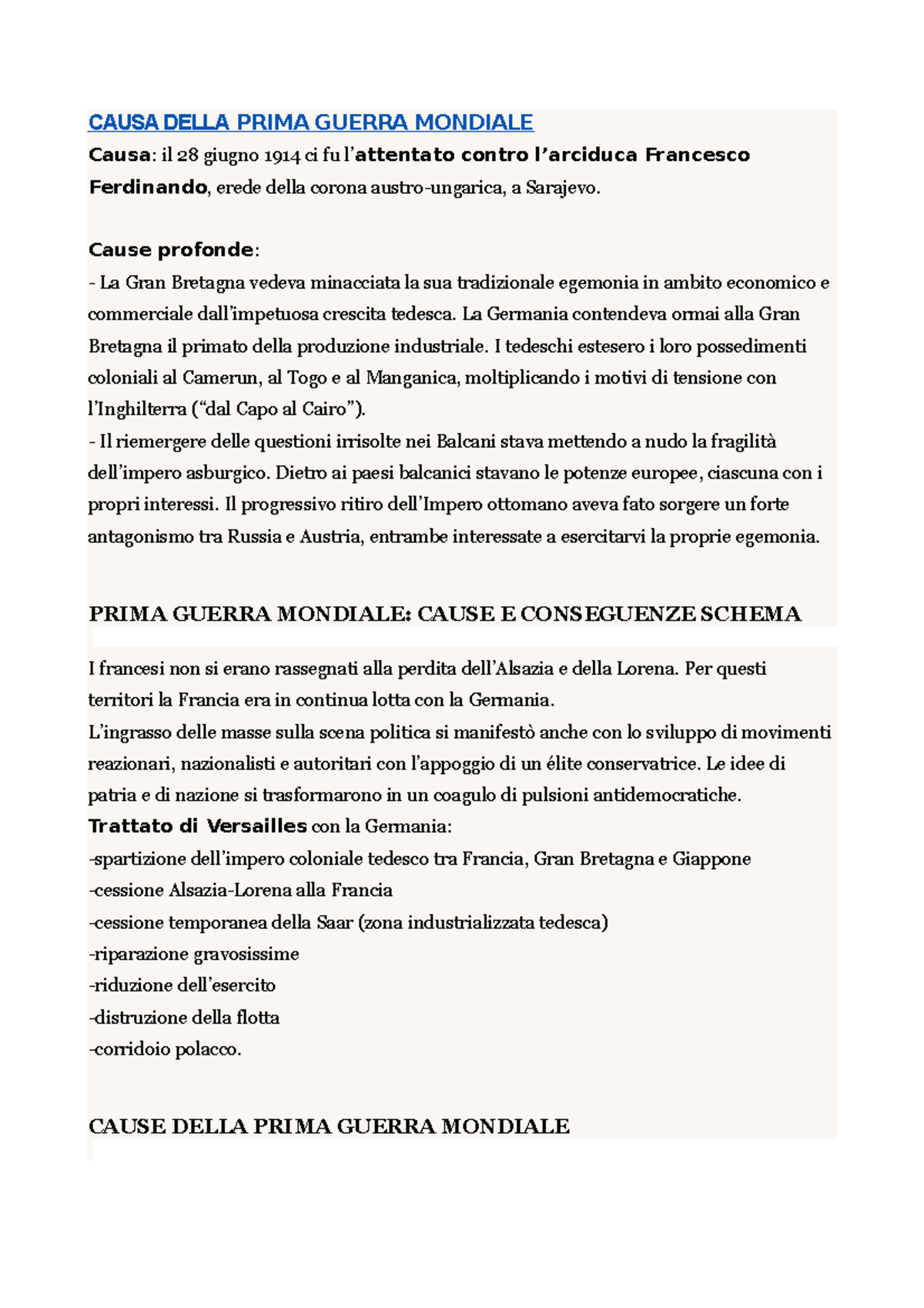 Prima Guerra Mondiale - Appunti presi durante la lezione in aula - CAUSA DELLA PRIMA GUERRA MONDIALE - Studocu