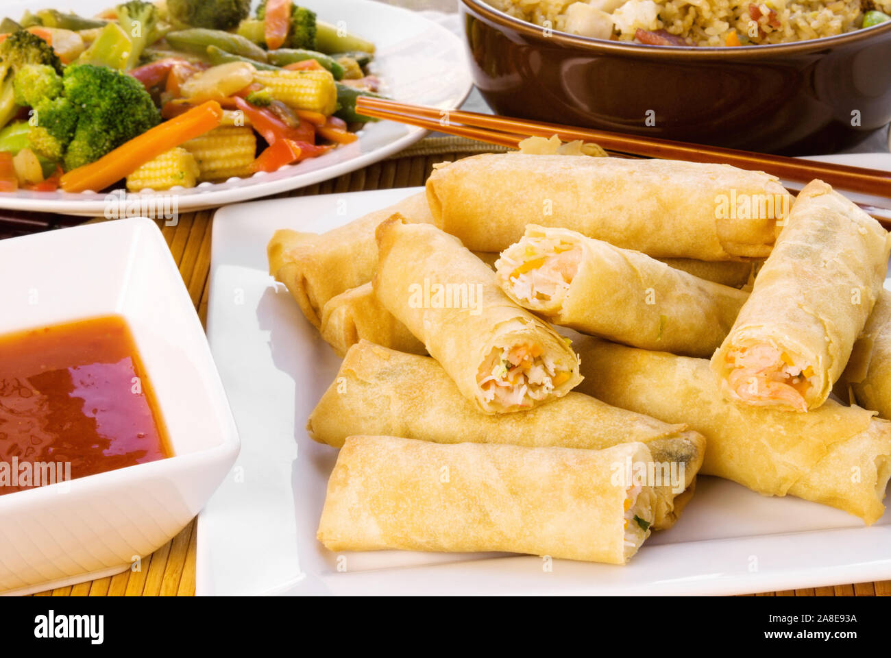 Gamberetti involtini primavera serviti con Asian stir fry pollo e riso saltato con verdure. Un dolce degustazione di salsa di immersione è incluso. Girato in giorno naturale Foto stock - Alamy
