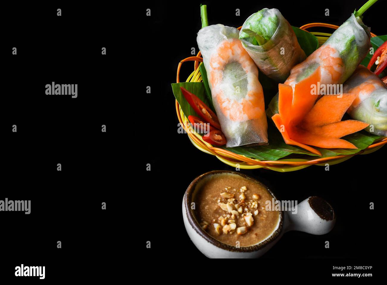 Involtini primavera vietnamiti tradizionali con gamberetti, carta di riso su sfondo nero Foto stock - Alamy