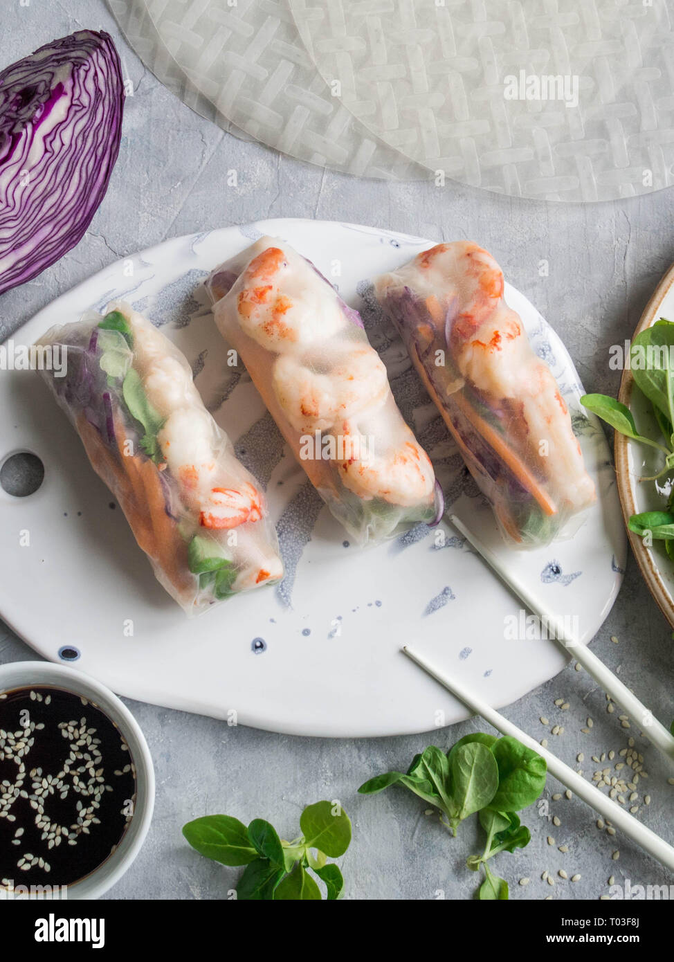 Involtini primavera con carote, cavolo rosso, mais lattuga e gamberi su una ceramica bianca bordo. La salsa di soia con semi di sesamo su sfondo grigio Foto stock - Alamy