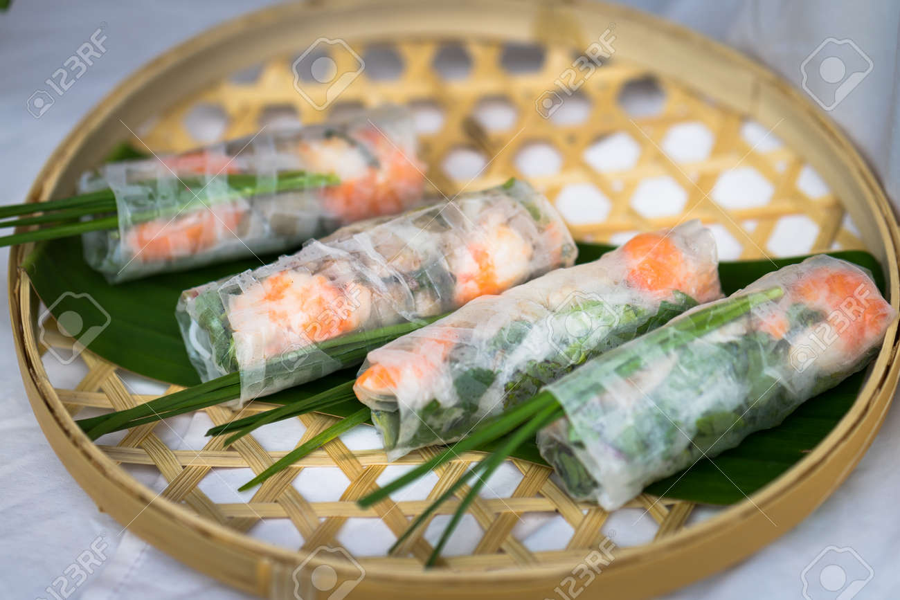 Immagini Stock - Involtini Primavera Freschi Con Gamberetti Sul Piatto Di Bambù. Image 75817198