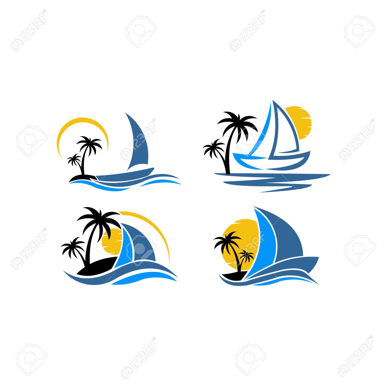 SVG, Vettoriale - Logo Di Ispirazione Di Una Barca Con Palma. Icona Di Vettore Nave In Mare Con Testo Isolato. Emblemi Rotondi Per La Progettazione Di Affari, Vacanze, Agenzia Di Viaggi, Yachting