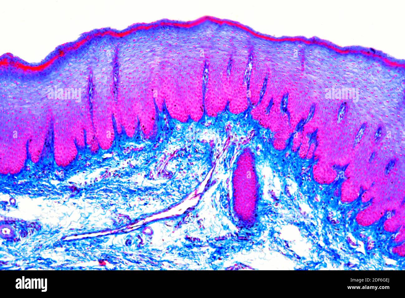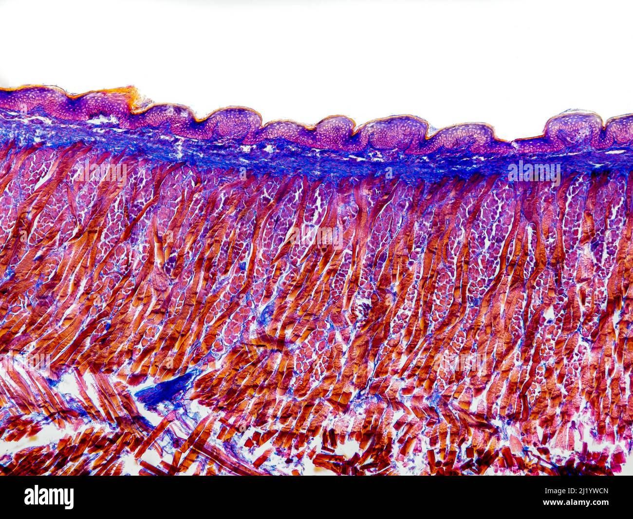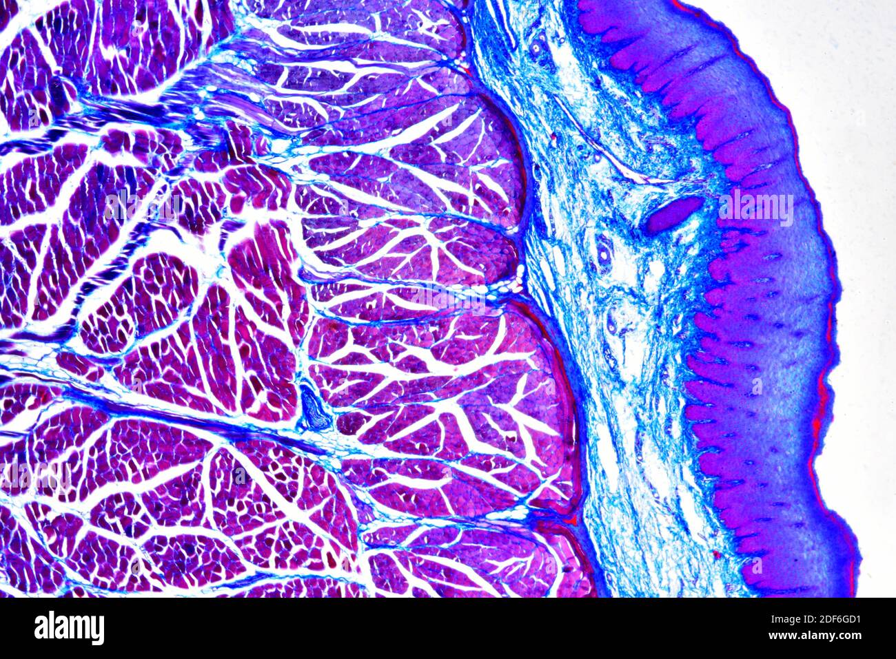 Sezione della lingua che mostra le papille gustative, i muscoli striati e il tessuto connettivo. Microscopio ottico X100 Foto stock - Alamy