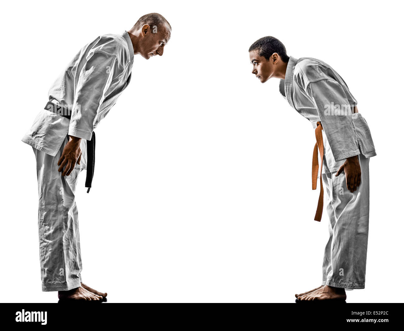 Two karate men sensei and teenager student fighters fighting isolated on white background Stock Photo - Alamy