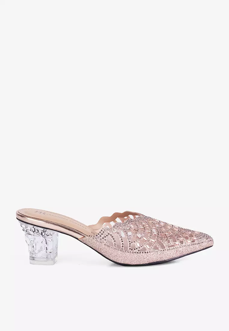 Sandal heels slide wanita pink pesta kaca, Fesyen Wanita, Sepatu di Carousell