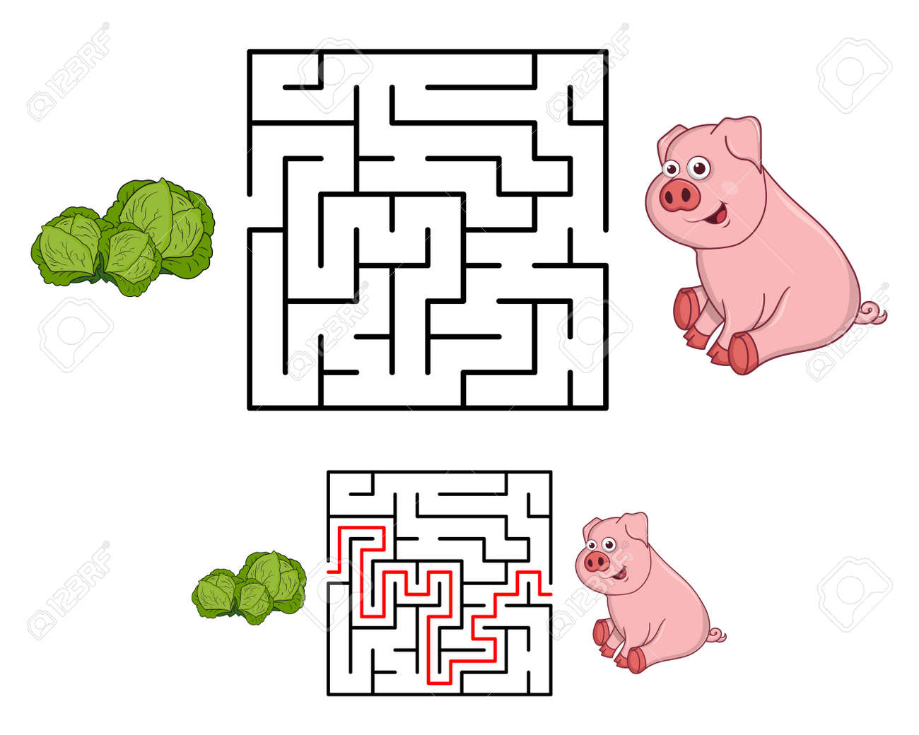 SVG, Vettoriale - Labirinto O Labirinto Per Bambini Con Maiale Cartone Animato E Cavolo. Trova La Strada Giusta. Semplice Labirinto Quadrato Con Risposta. Entrata E Uscita. Gioco Di Puzzle Per Bambini. Educazione