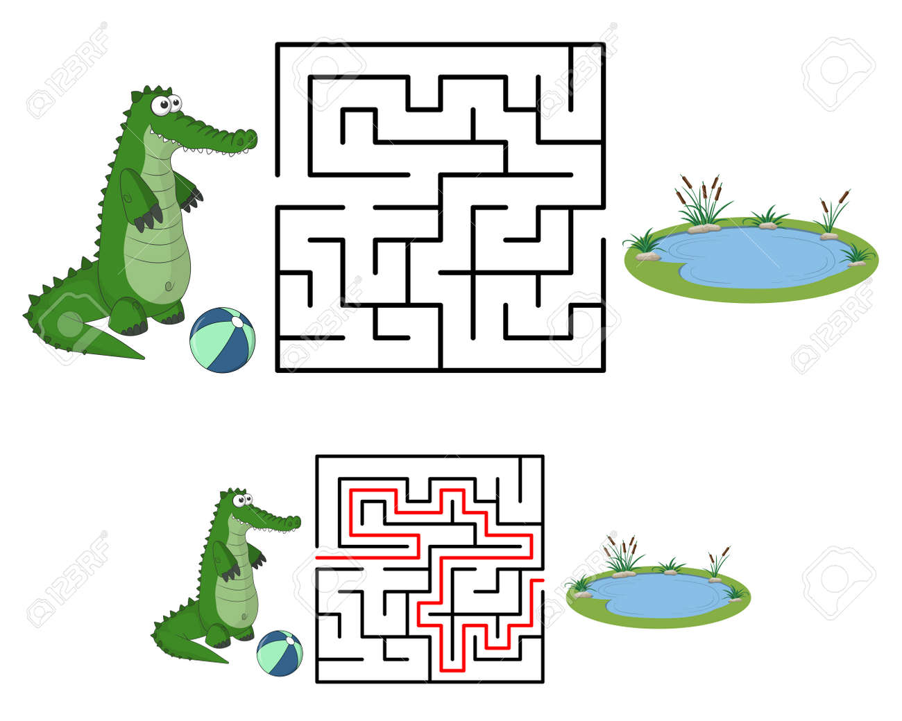 SVG, Vettoriale - Labirinto O Labirinto Per Bambini Con Alligatore Cartone Animato E Lago. Trova La Strada Giusta. Semplice Labirinto Quadrato Con Risposta. Entrata E Uscita. Gioco Di Puzzle Per Bambini. Educazione