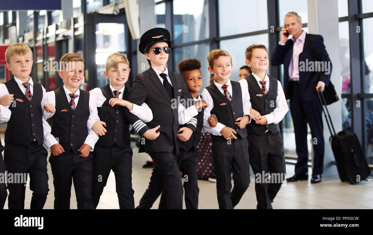 I bambini del personale easyJet ricreare una famosa scena da Hollywood cattura me se è possibile a Londra aeroporto di Southend per segnare il lancio di una campagna nazionale di ispirare più