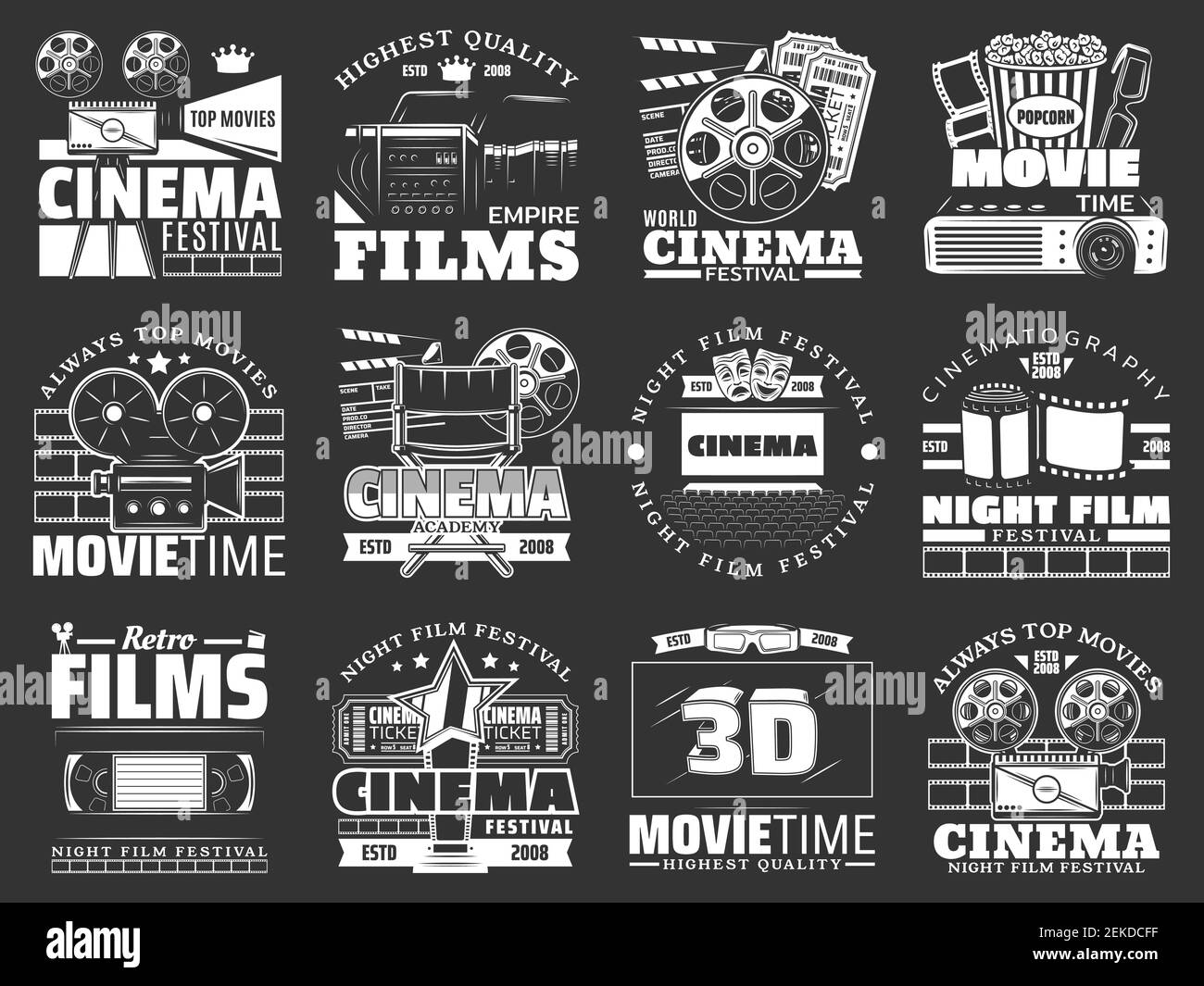 Cinema and movie vector badges with film reel, movie theater and tv set, popcorn, 3d glasses and video tape, camera, tickets and projector, clapperboa Stock Vector Image & Art - Alamy