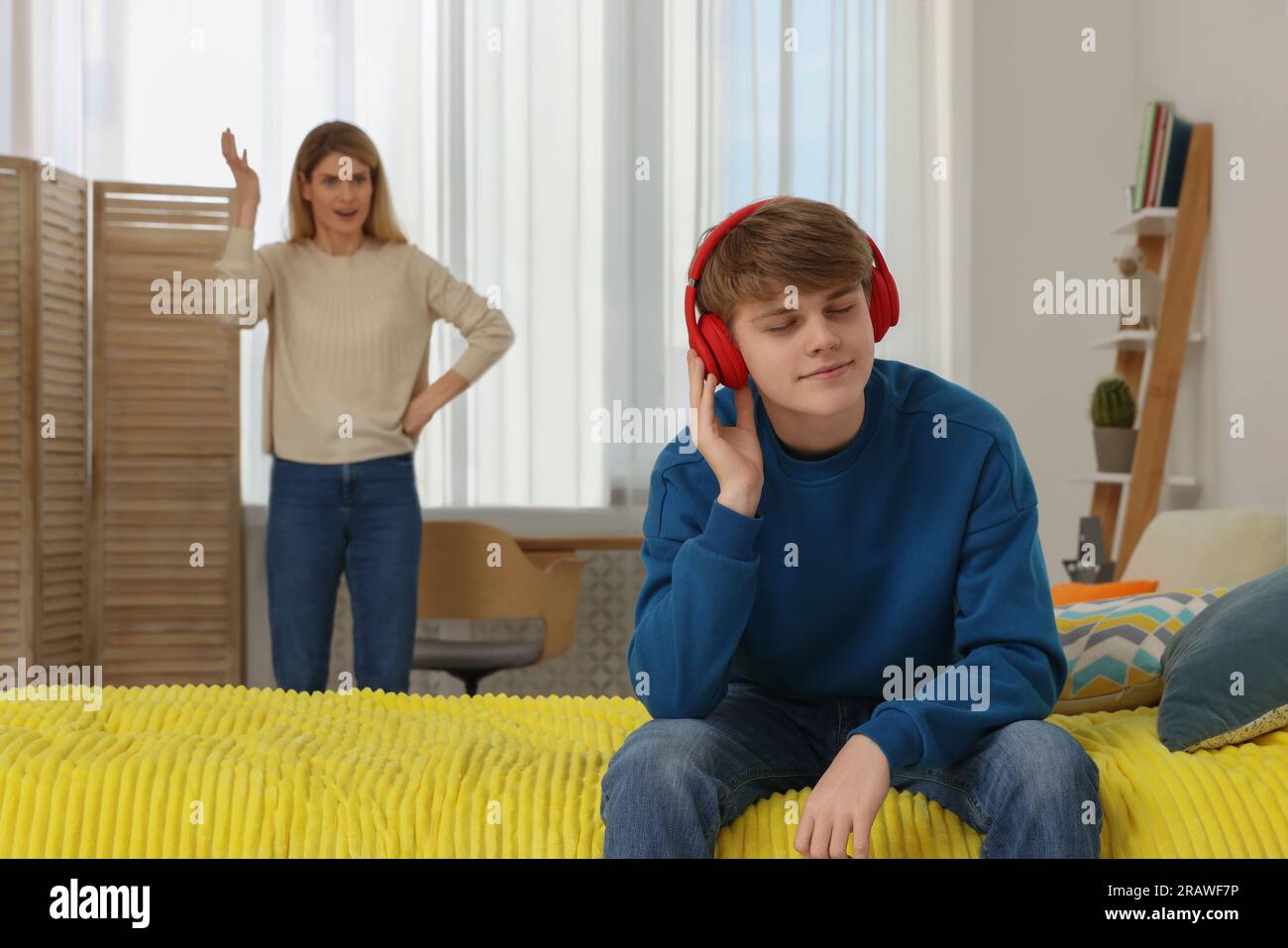 Figlio adolescente in cuffia che ignora sua madre a casa Foto stock - Alamy