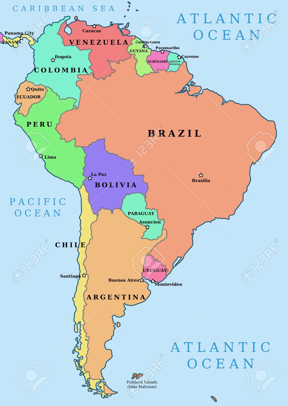 SVG, Vettoriale - Colorful Sud America Mappa Con I Paesi E Le Città Capitali. Image 21801446