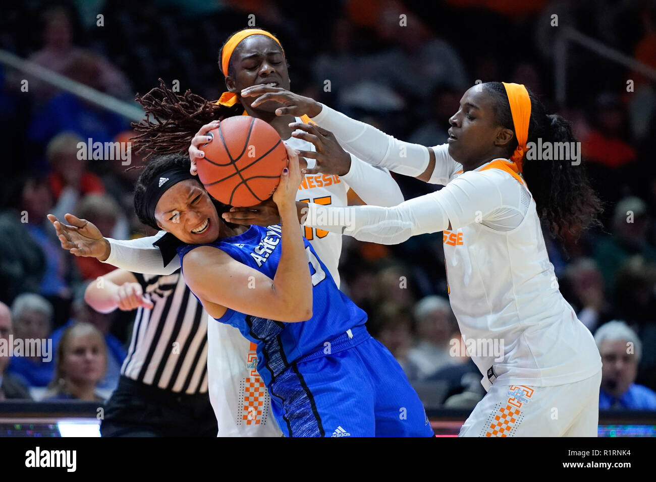 Knoxville, Tennessee, Stati Uniti d'America. 14 novembre 2018: Meme Jackson #10 e Cheridene Verde #15 del Tennessee Lady Volunteers tenta di rubare la palla da Sonora Dengokl #15 del North Carolina Asheville