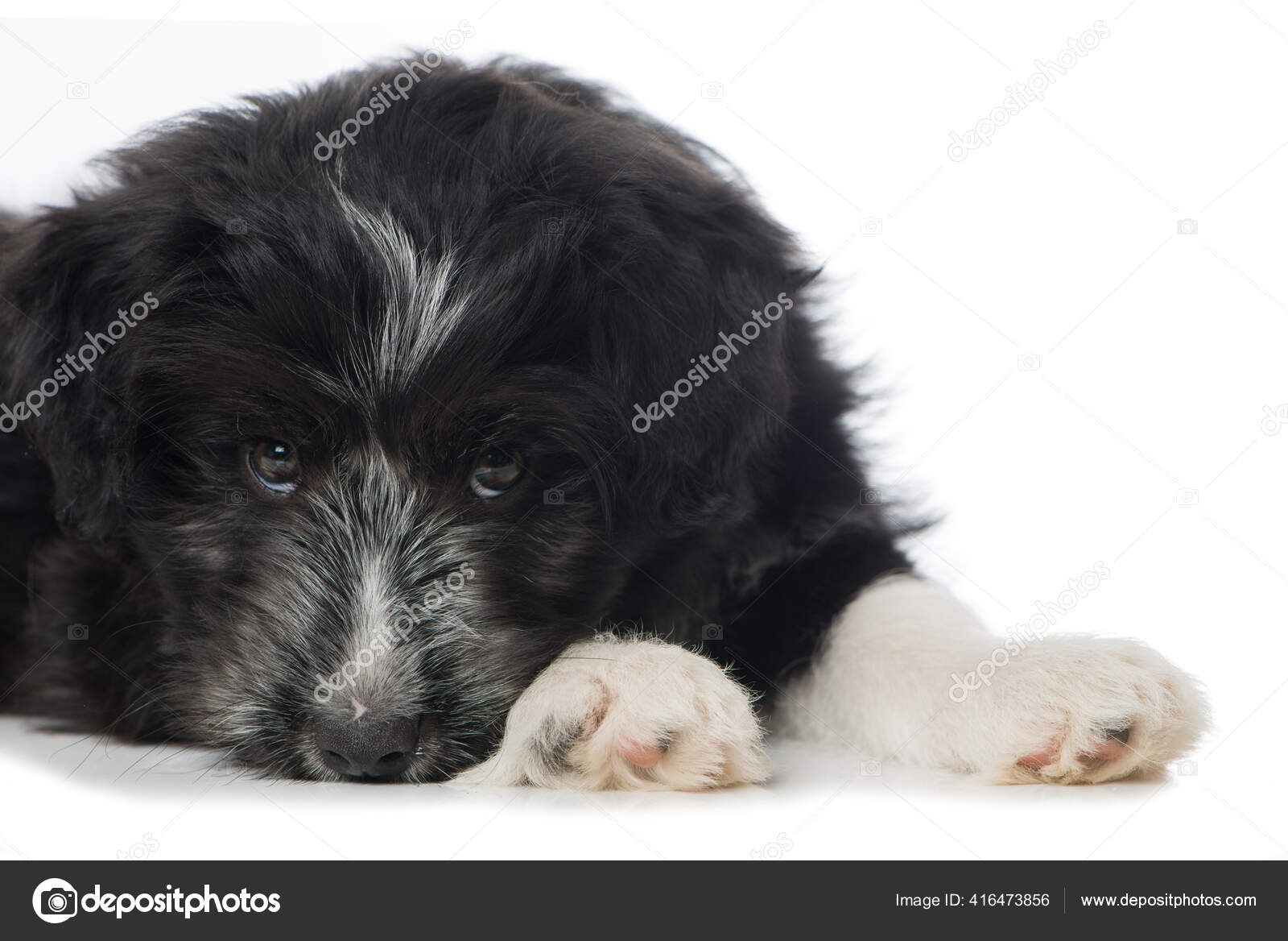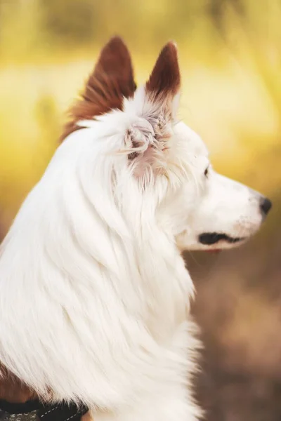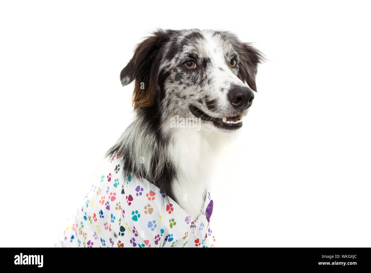 Immagini Stock - Border Collie Pastore Australiano Cane Mix Sdraiato Sulla Pista Di Fronte Aereo Con Le Orecchie Metà Avviso Che Indossa Sciarpa Bianca Cercando Di Avviso Curioso Osservare Avventuroso In Attesa