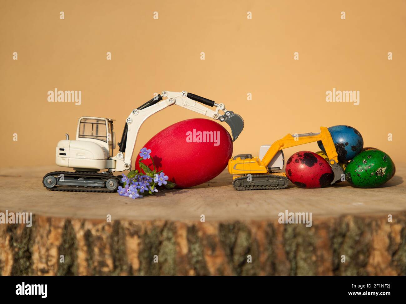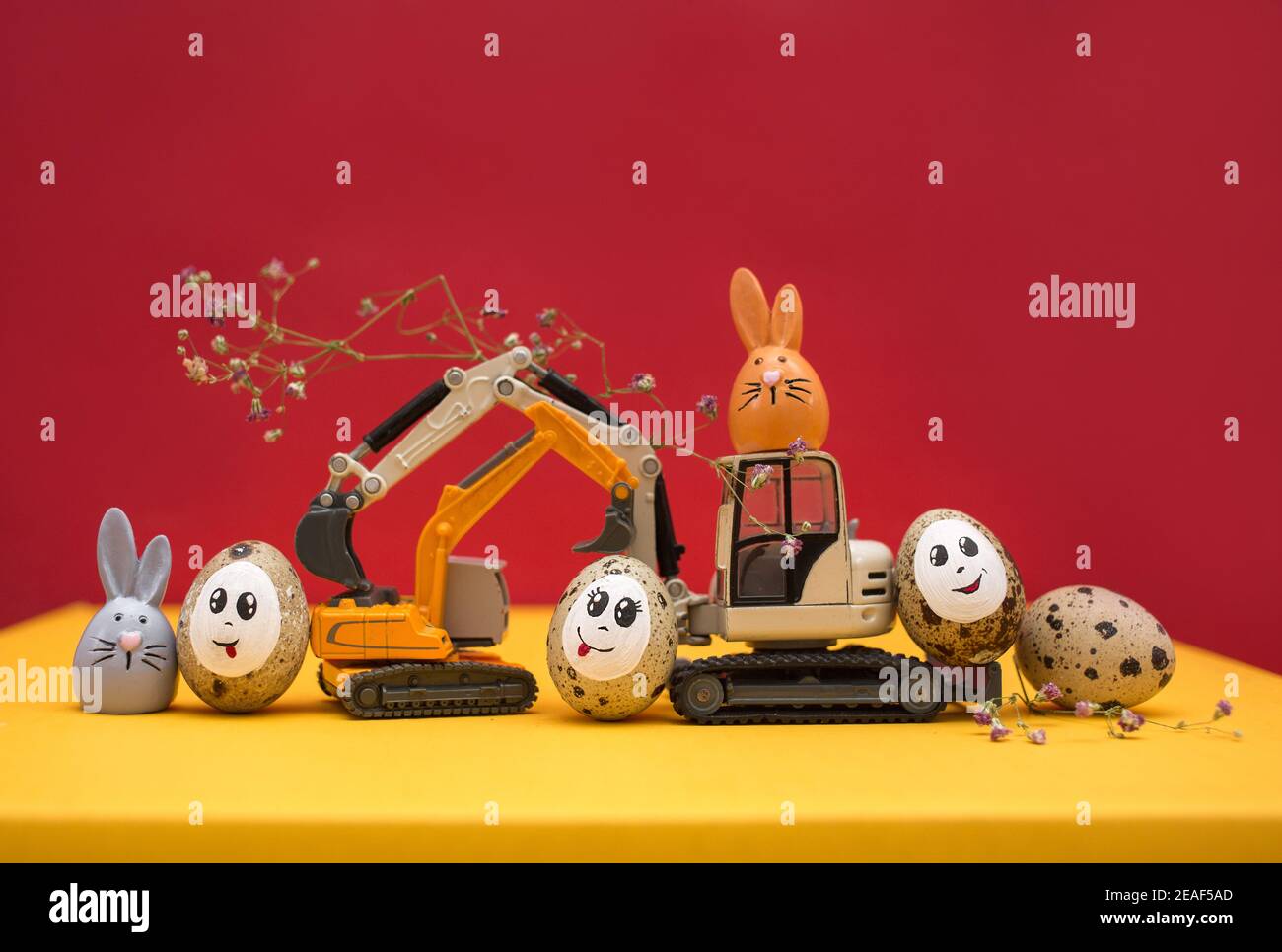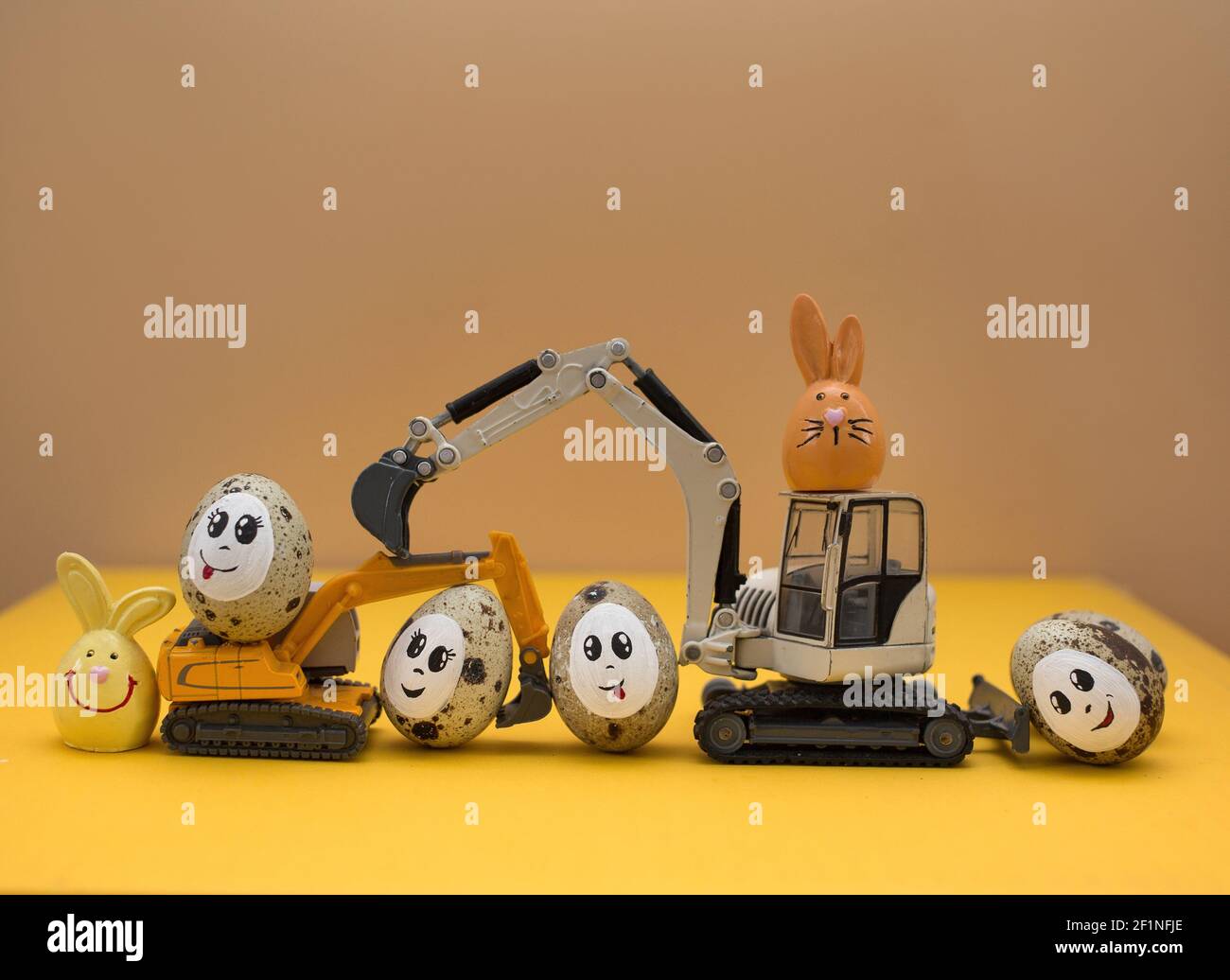 Modelli di escavatori giocattolo, coniglietti pasquali, uova di quaglia pasquale con sorrisi dipinti e occhi. Congratulazioni concetto per le imprese di costruzione di affari. Pos Foto stock - Alamy