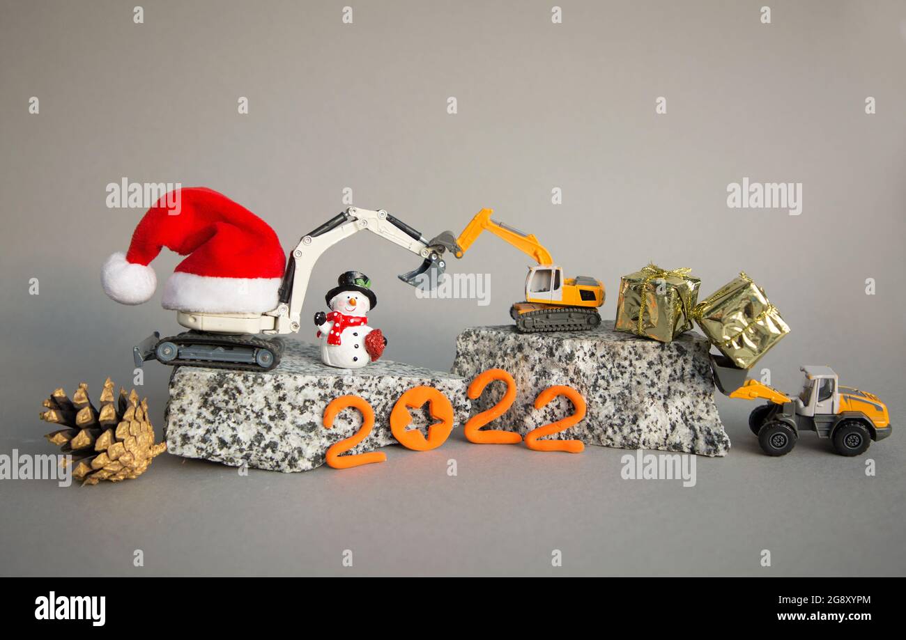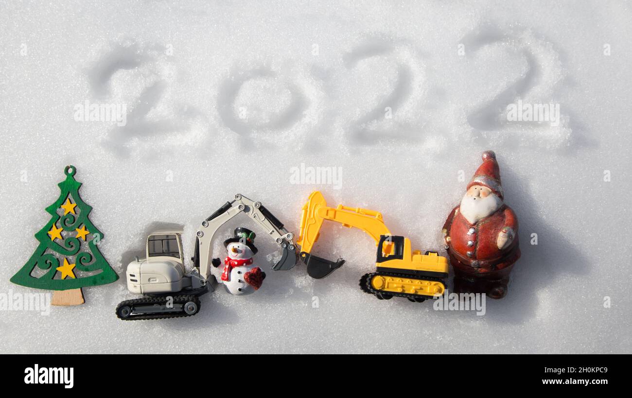 Due modelli di escavatori giocattolo, un uomo di neve souvenir, babbo natale giacciono sulla neve bianca. I numeri 2022 sono scritti nella neve. Scheda per Natale busi Foto stock - Alamy