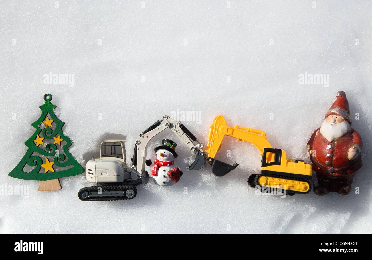 Due modelli di escavatori giocattolo, un uomo di neve souvenir, babbo natale giacciono in fila su neve bianca. Concetto per Natale affari saluti, Capodanno vacanze Foto stock - Alamy