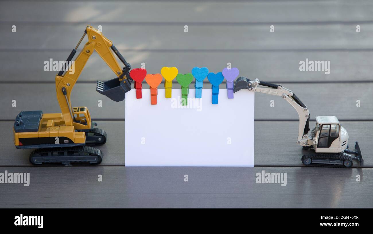 Modelli di escavatori giocattolo contengono foglio bianco di carta per il testo. luogo di annuncio, pubblicità, affari - congratulazioni alla società di costruzione Foto stock - Alamy