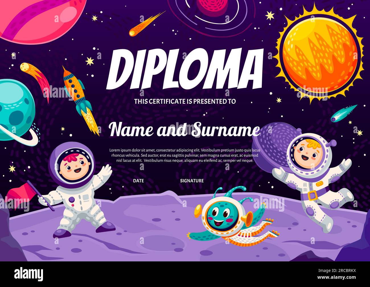Diploma per bambini, astronauti di cartoni animati e alieni sulla superficie del pianeta, modello di certificato vettoriale. Diploma di riconoscimento per scuola o asilo con capretto spaziale e alieno nel pianeta spaziale