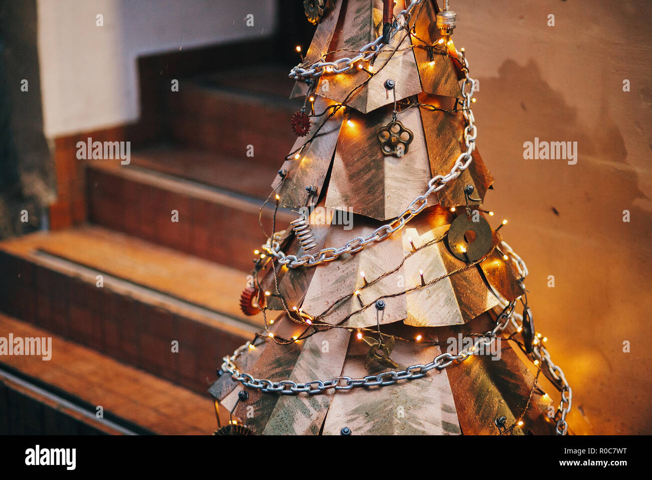 Steampunk árbol de navidad. Steampunk creativo árbol de acero con adornos de metal y ramas, elegantes adornos navideños y la guirnalda de luces europea Fotografía de stock - Alamy